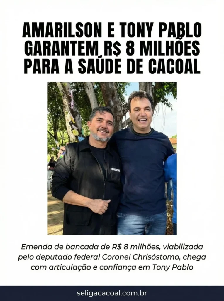 Emenda de bancada de R$ 8 milhões, viabilizada pelo deputado federal Coronel Chrisóstomo, chega com articulação e confiança em Tony Pablo