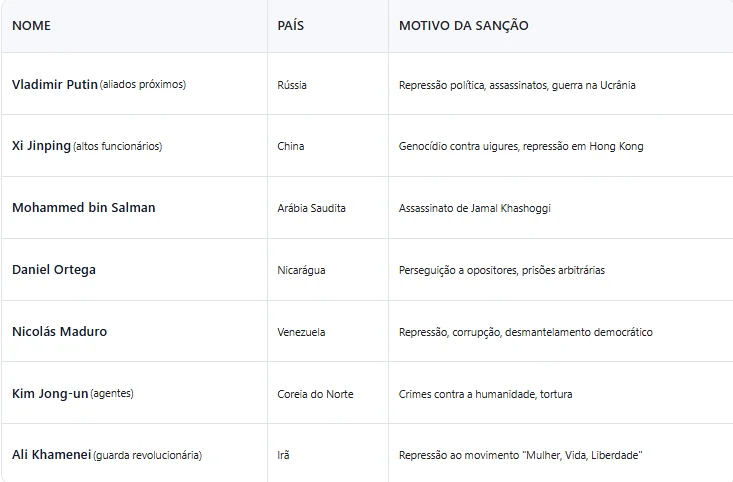 O que torna o caso de Moraes tão simbólico — e explosivo — é com quem ele está sendo comparado. Abaixo, alguns dos nomes que já foram sancionados pela mesma lei: