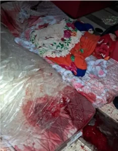 As imagens registradas no imóvel mostram um cenário com grande quantidade de sangue sobre o colchão, roupas de cama e no piso, indicando a violência da ação. Outra imagem mostra a presença de ambulância do Samu e viatura policial na área da ocorrência, em um ponto de acesso cercado e com vegetação ao fundo.