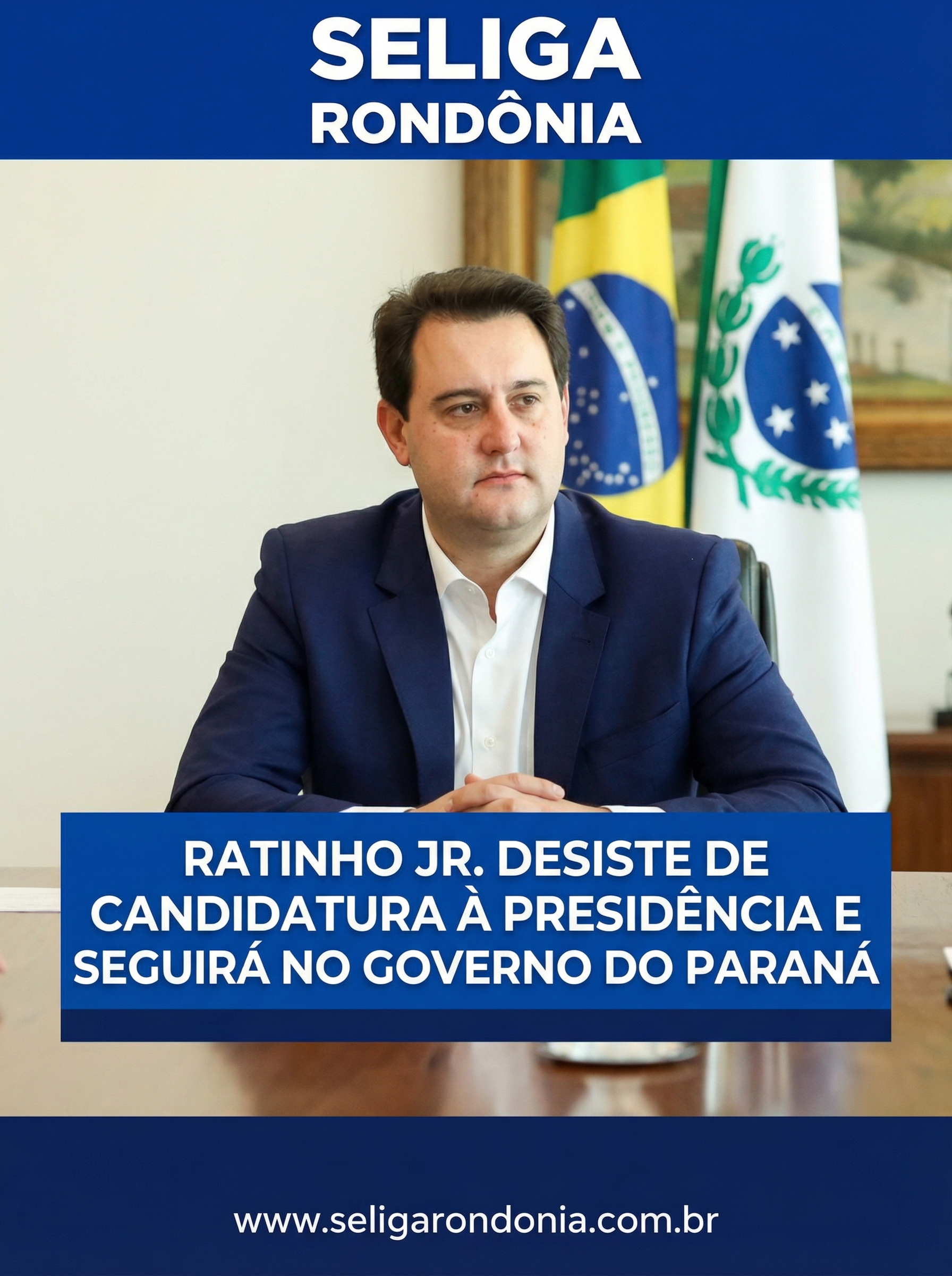 O governador do Paraná, Carlos Massa Ratinho Junior (PSD), anunciou nesta [dia da semana] que desistiu da pré-candidatura à Presidência da República e permanecerá no comando do governo estadual até o fim do mandato, em 2026.