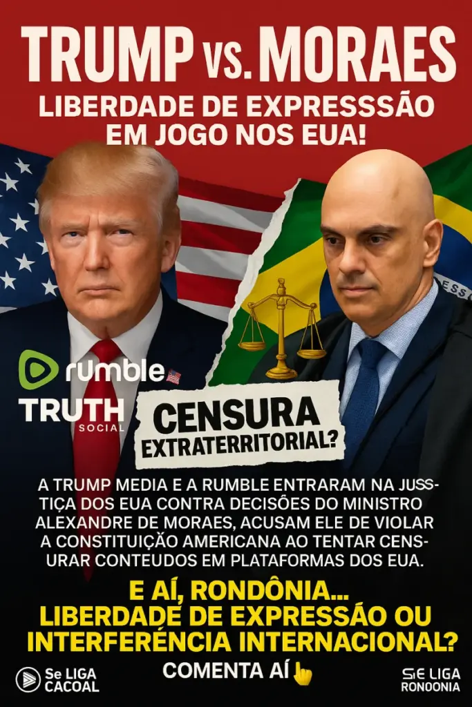 A Rumble (plataforma alternativa ao YouTube) e a Trump Media alegam que Moraes exige cumprimento de decisões brasileiras mesmo sem operação direta no Brasil, ameaçando liberdades constitucionais americanas. O STF não se manifestou até o momento.